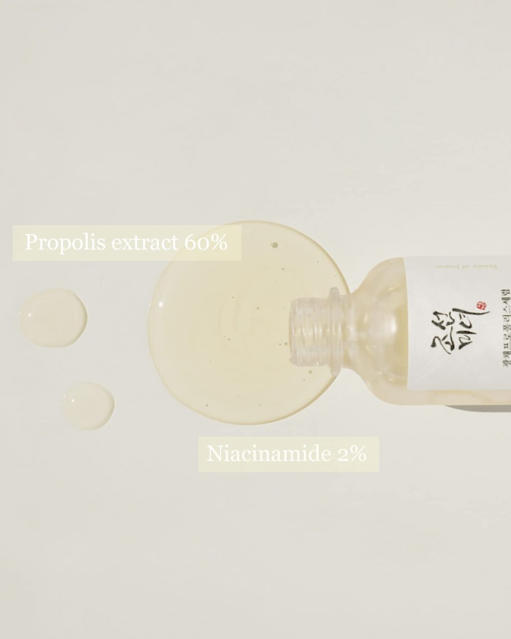 O ορός προσώπου της Κορεάτικης Εταιρείας καλλυντικών Beauty of Joseon Glow Serum με πρόπολη και νιασιναμίδη βοηθά την μείωση των πόρων ενώ έχει αντιφλεγμονώδη δράση. Περιέχει εκχύλισμα 60% πρόπολης και 2% νιασιναμίδη, βοηθά στον έλεγχο της έκκρισης σμήγματος και διατηρεί το δέρμα υγρό.